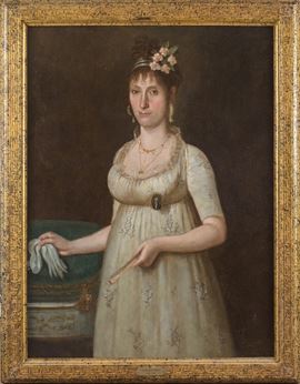 Il fondo scuro e neutro accentua l’immediatezza della presenza della dama, mentre la sobria costruzione della posa e la resa del volto, attenta ma non idealizzata, collocano il dipinto nell’ambito della ritrattistica spagnola d’inizio XIX secolo, con riferimenti al linguaggio di Goya e della sua cerchia. In cornice.