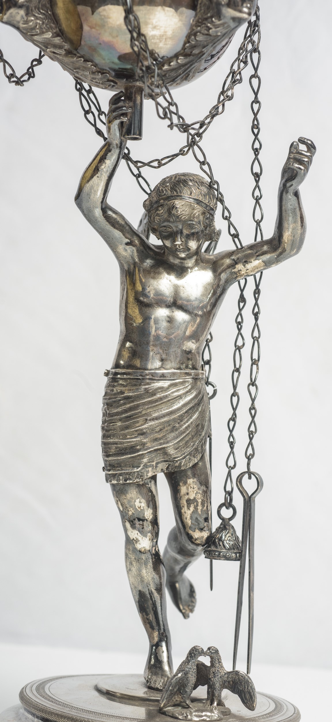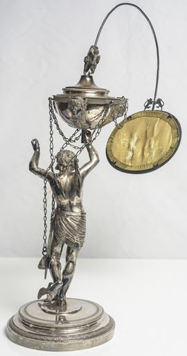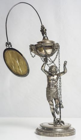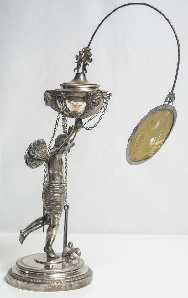 sbalzato e cesellato, con figura alata centrale su piedistallo circolare che sorregge una coppa portaolio a tre becchi formati da teste di cariatidi, tre utensili a cura della fiamma, ventola paraluce posteriore.