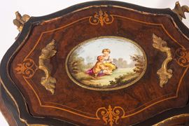 In legno ebanizzato, radica di thuya e bosso. Applicazioni in bronzo e placca superiore in porcellana policroma.