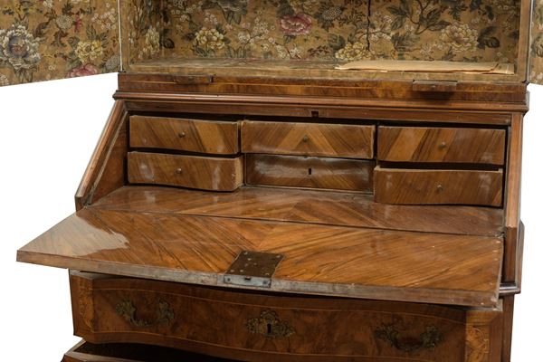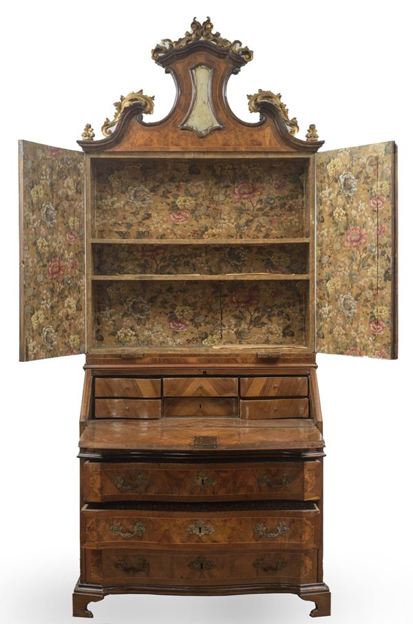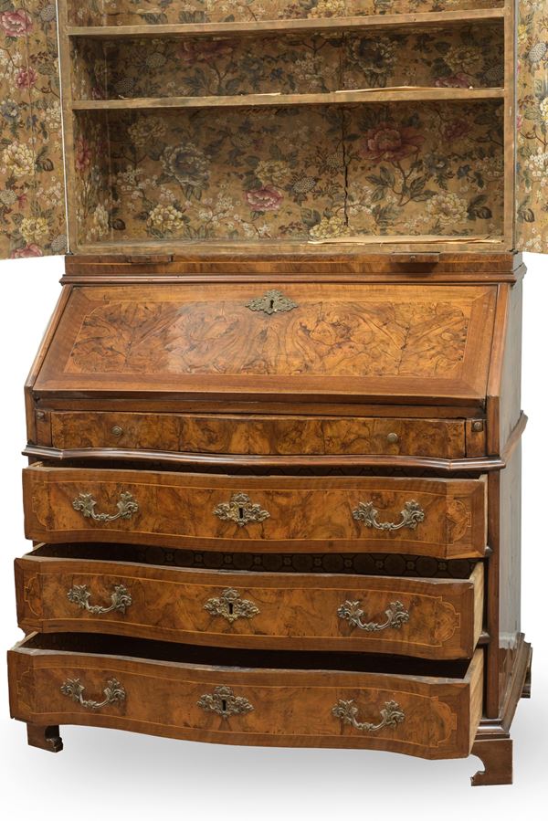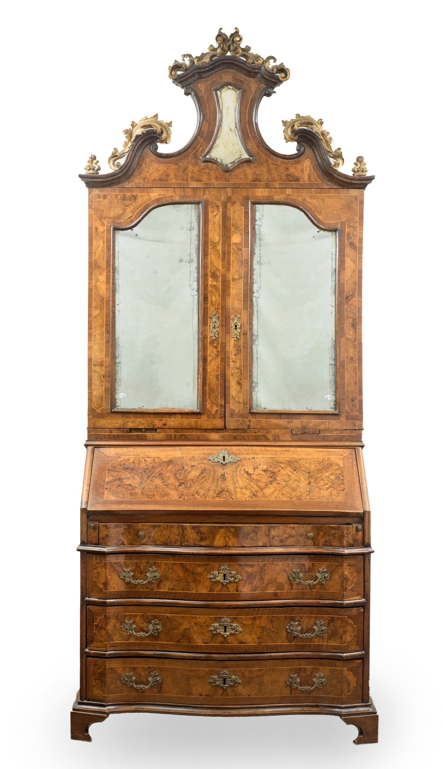 a due corpi, lastronato in noce e radica di noce con filettature in bosso, applicazioni in bronzo. Tre cassetti e mezzo cassetto superiore, ribalta con cassettiera interna, corpo superiore a due ante con specchi pertinenti. Cimasa superiore in legno intagliato e dorato. Fronte mosso e piedi a mensola.