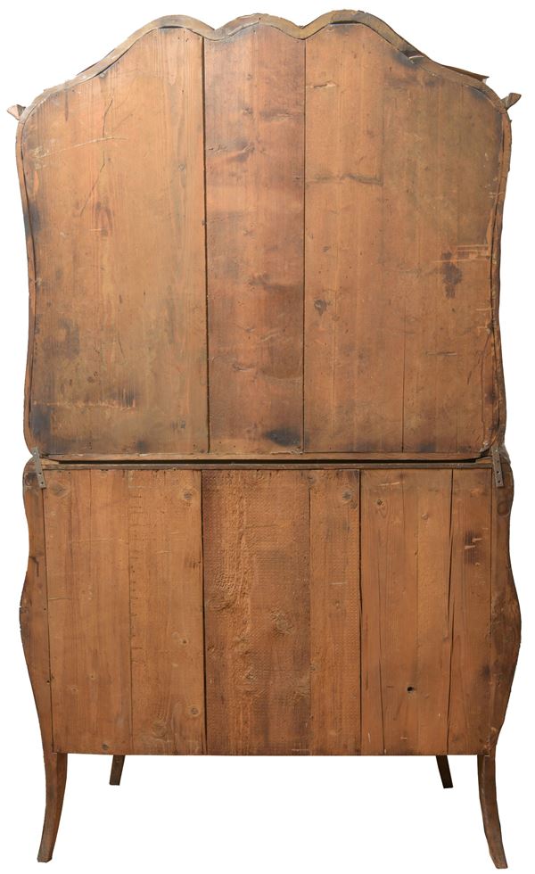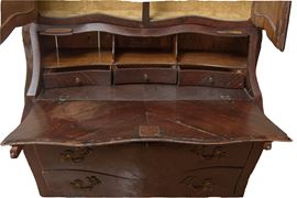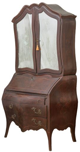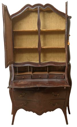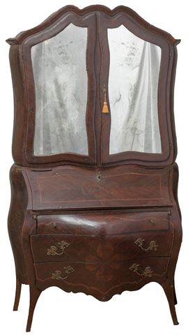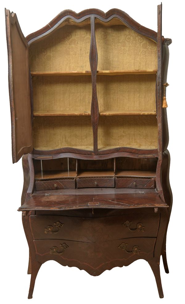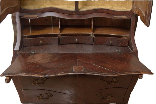 In legno di palissandro, ebano rosa e ebano viola. Sul fronte fianchi sagomati, marchetteria a quadrifoglio, tre cassetti con ribalta e cassettiera interna. Corpo superiore con ripiani interni. Restauri alla cassettiera interna e parte della fodera superiore sostituita