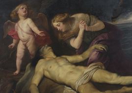 Il dipinto raffigura il celebre mito di Ero e Leandro: il giovane, travolto dalle onde mentre tenta di raggiungere l’amata, giace esanime sulla riva del mare. Accanto a lui Ero, disperata, si china stringendo le mani in segno di dolore, mentre Cupido assiste in lacrime alla tragedia. In primo piano conchiglie e un granchio evocano il contesto marino, mentre sullo sfondo il paesaggio notturno contribuisce a sottolineare il pathos drammatico della scena.