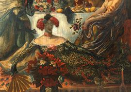 Il confronto con la produzione di Félicien Rops si impone soprattutto per la qualità ambigua e dissacrante di alcune figure e per l’impostazione simbolico-erotica della scena. In particolare, la presenza di un personaggio dall’identità incerta, quasi travestita, e la costruzione allegorica del femminile come spazio di seduzione e ritualità richiamano motivi tipici della cultura ropsiana. Va tuttavia osservato che la produzione pittorica monumentale di Rops è limitata rispetto alla sua vasta attività grafica e incisoria, e che il linguaggio del maestro belga si caratterizza per un tratto più incisivo e satirico, mentre nel dipinto in esame prevale una stesura pittorica più morbida e atmosferica. Ne consegue che, allo stato attuale delle conoscenze, non sussistono elementi sufficienti per una attribuzione diretta, ma è plausibile ipotizzare una relazione culturale con il suo ambiente o con la cerchia simbolista franco-belga gravitante attorno ai circoli esoterici della Rose+Croix.