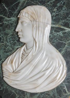 Elegante bassorilievo in marmo bianco su fondo in marmo verde Alpi, raffigurante busto femminile di profilo con capo velato.