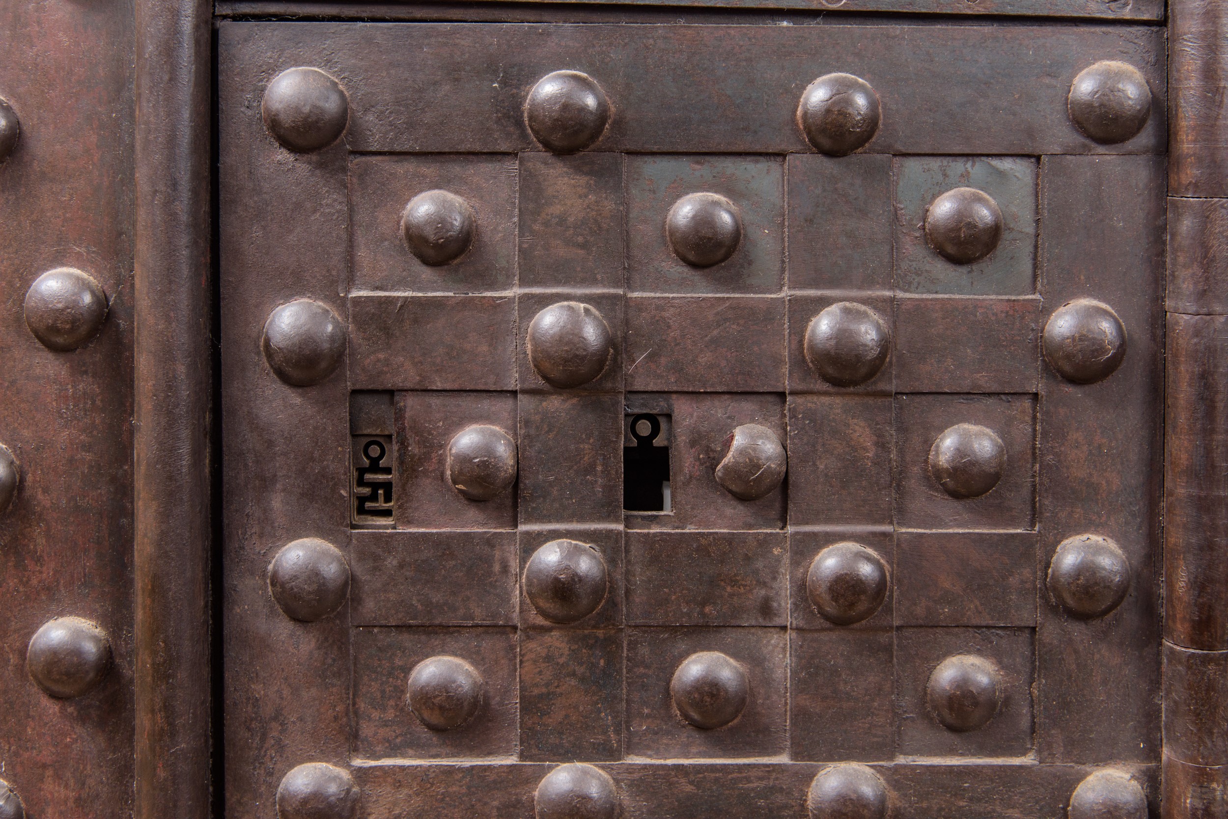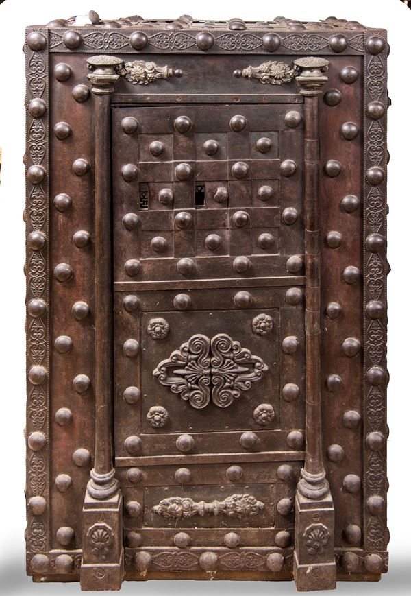 Rara cassa forte rinascimentale interamente rivestita in piastre di ferro con fitta borchiatura emisferica disposta su registri regolari. Il prospetto è architettonicamente impostato con lesene laterali su basi modanate e pannellatura centrale scandita da riquadri geometrici; applicazioni decorative in ferro fuso e cesellato arricchiscono lo sportello principale, celante serratura con articolato meccanismo interno.