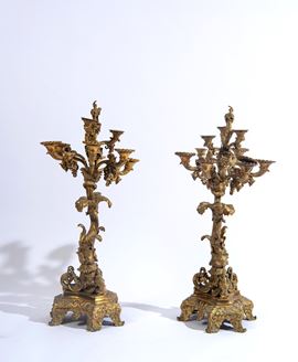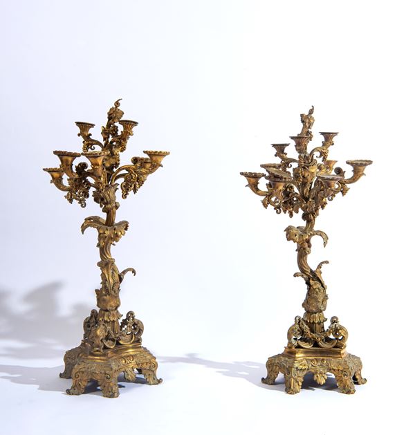 Importante coppia di candelieri a nove luci, riccamente ornati da motivi a volute, girali e ghirlande floreali.