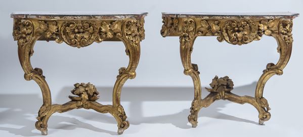 Elegante coppia di consolles a mensola in legno riccamente intagliato e dorato. Le gambe mosse sono raccordate da traversa sagomata.