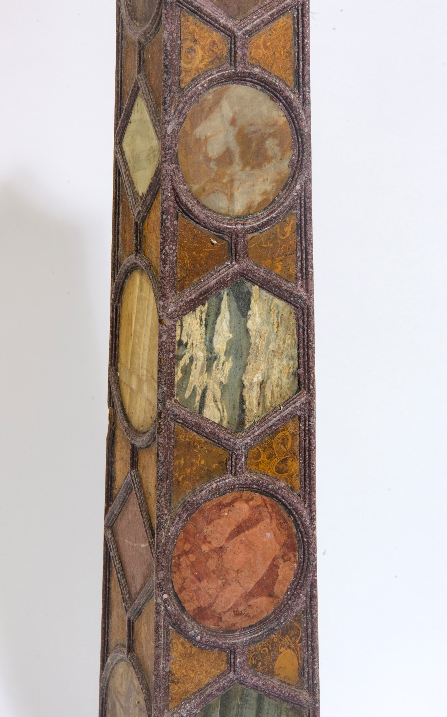 Obelischi a struttura in finto porfido, impreziosita da specchiature in marmi policromi, tra cui onice orientale, verde antico, lumachella e porta santa. Mancanze