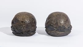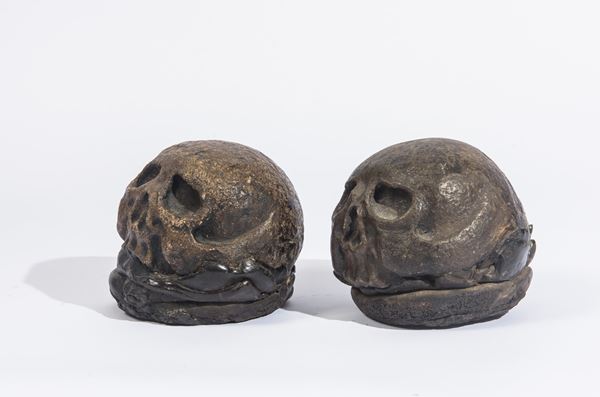 Rara coppia di sculture raffiguranti teschi, poggianti su basi sagomate, eseguite con modellato compatto e marcata definizione delle cavità orbitali e della dentatura. L’essenzialità formale e la forte valenza simbolica rimandano alla tradizione iconografica del memento mori, ampiamente diffusa nella cultura figurativa rinascimentale in ambito religioso e meditativo. Manufatti di significativa suggestione, riconducibili alla produzione italiana del XVI secolo poggianti su basi in pece.