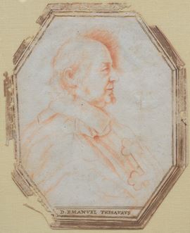 Il foglio raffigura il letterato e storico piemontese Emanuele Tesauro (1592–1675), rappresentato a mezzo busto entro un medaglione architettonico di impianto illusionistico. Il volto, leggermente ruotato verso destra, è caratterizzato da una penetrante introspezione psicologica; i tratti fisionomici, baffi sottili, barba appuntita, sguardo vigile, sono costruiti attraverso un tratteggio fitto e modulato, con sapienti passaggi chiaroscurali che conferiscono rilievo plastico all’incarnato.