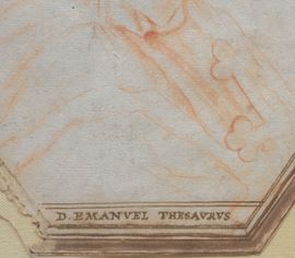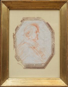 L’attribuzione si fonda su affinità stilistiche nella resa dei volumi e nell’intensità espressiva del volto, nonché su considerazioni di ordine storico-artistico relative ai rapporti tra ambienti pittorici e produzione incisoria nella Torino degli anni Sessanta del Seicento.Si propone di identificare il foglio come il modello preparatorio da cui fu tratta l’incisione realizzata nel 1663: le stringenti corrispondenze compositive, nell’impostazione del busto, nella rotazione del capo, nella struttura del medaglione e nella disposizione dell’iscrizione nominativa, suggeriscono infatti un rapporto diretto di derivazione. In tale prospettiva, il disegno assumerebbe un ruolo centrale nel processo ideativo dell’immagine incisa, configurandosi come prototipo ufficiale destinato alla traduzione su lastra e alla successiva diffusione a stampa. Entro cornice.