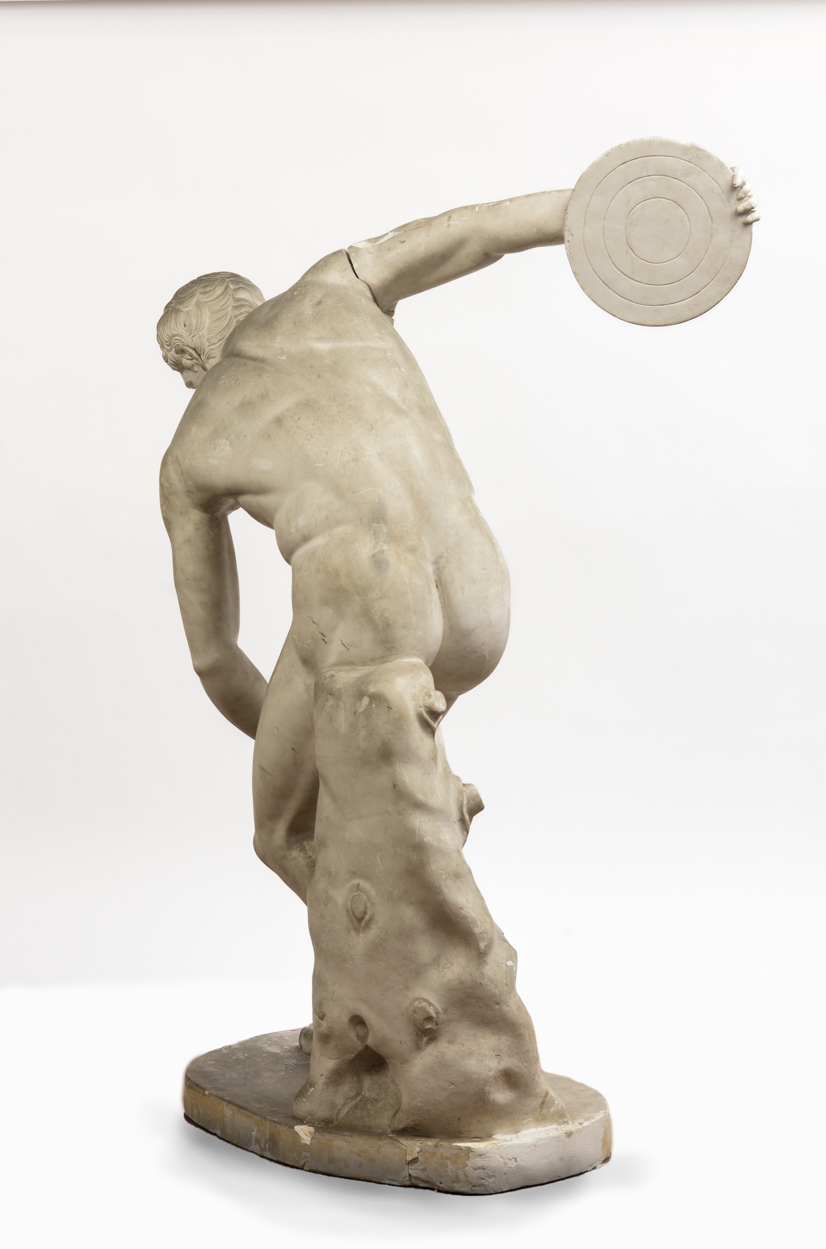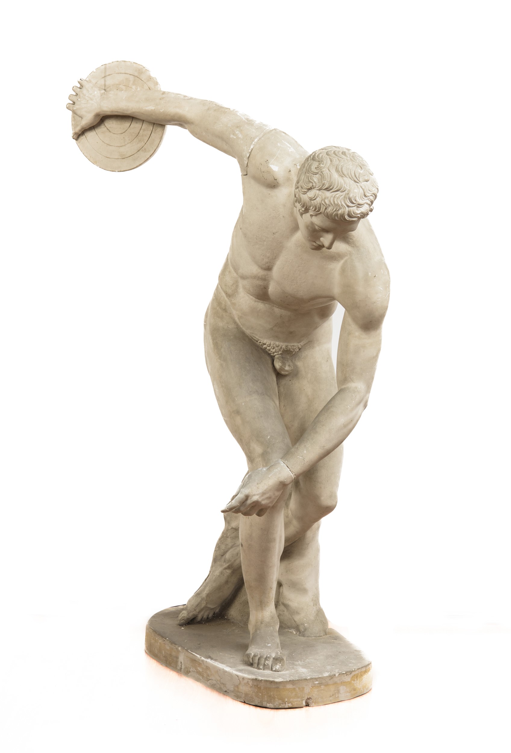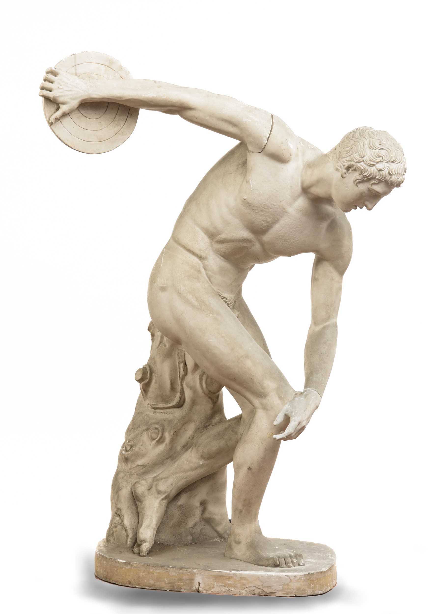Rara scultura in gesso, calco del celebre Discobolo Townlay, oggi conservato al British Museum di Londra, dal celebre modello antico di Mirone. La figura è colta nell’attimo che precede il lancio del disco, con il corpo torsionato in un equilibrio dinamico che esalta la tensione muscolare e l’armonia delle proporzioni.