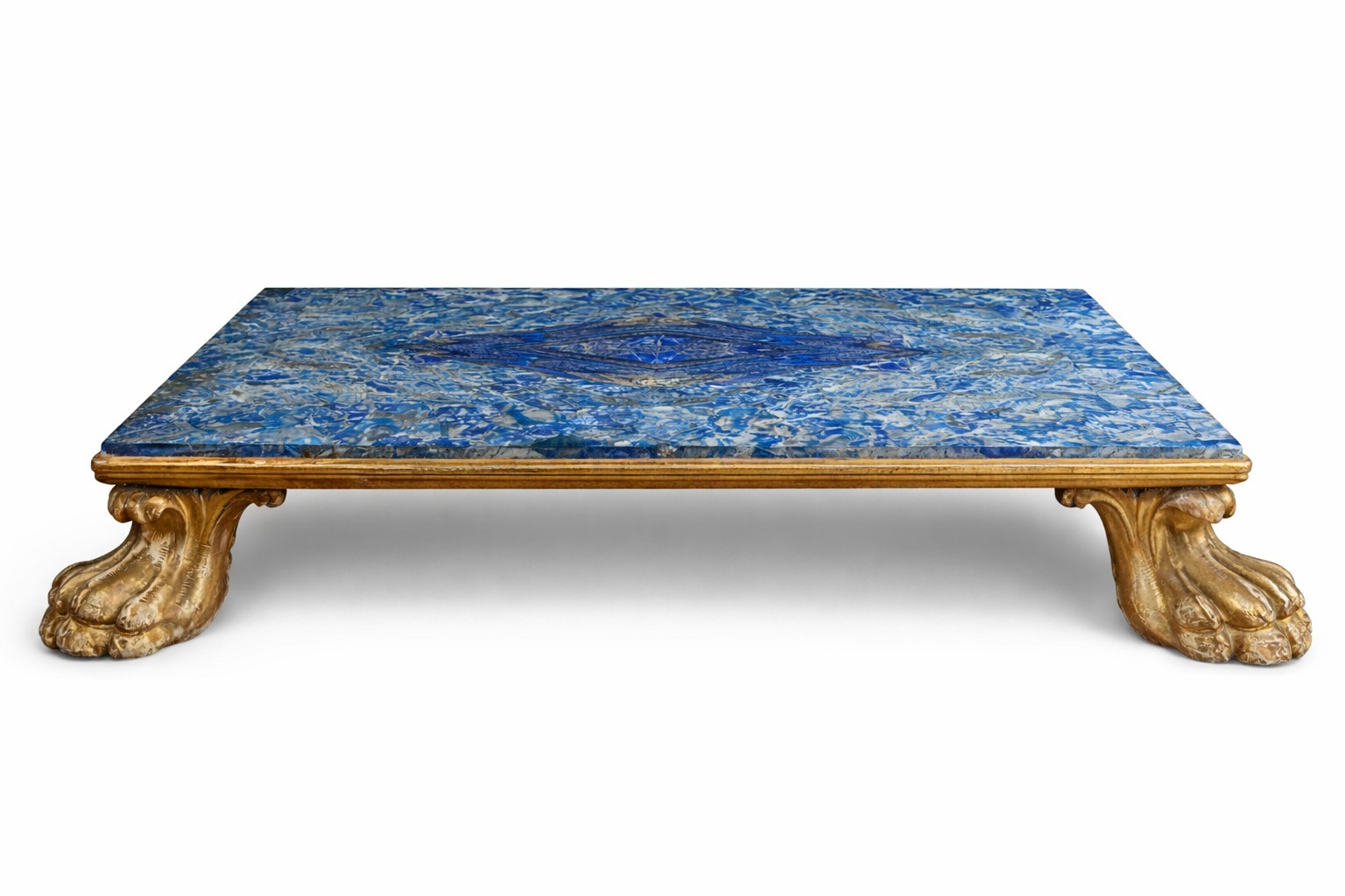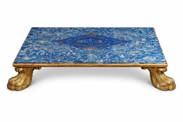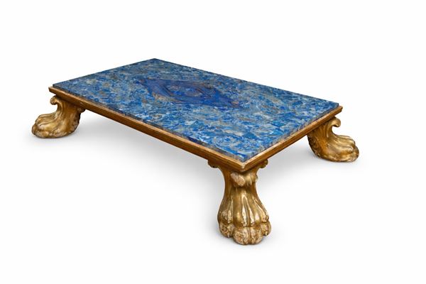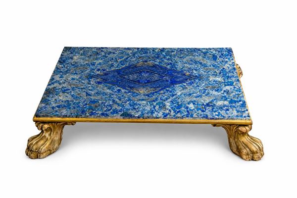 Tavolo da centro con struttura in legno riccamente intagliato e dorato, poggiante su quattro imponenti piedi ferini; piano rettangolare in lapislazzuli lastronati applicati su marmo bianco.