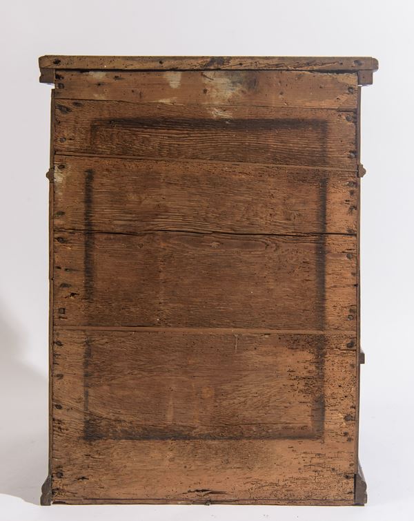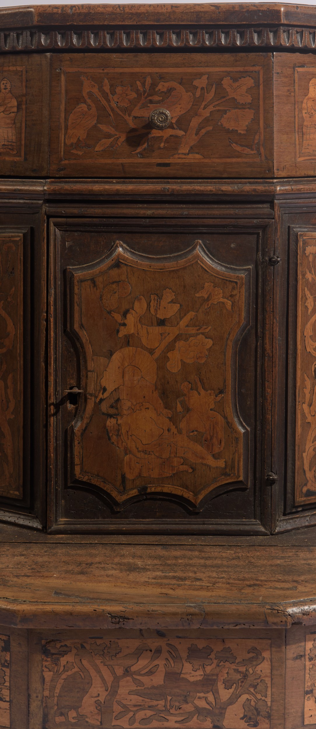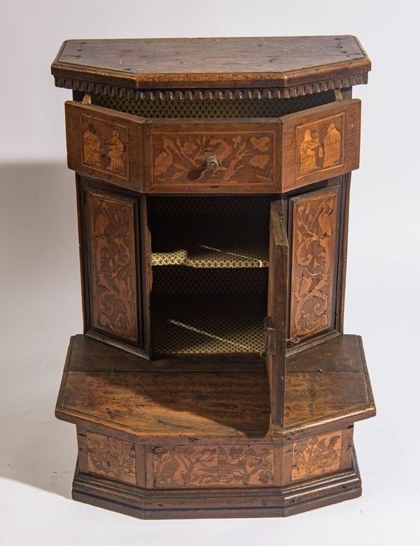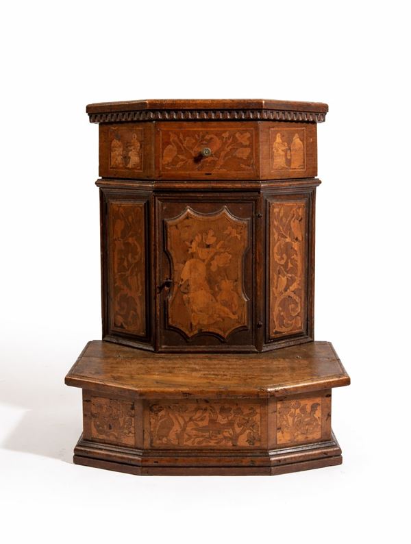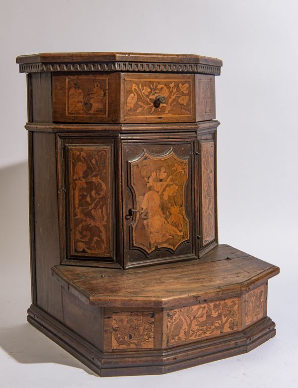 Inginocchiatoio a pianta ottagonale, interamente rivestito da riquadri a formelle intarsiate in legno di bosso. Il fronte presenta sportello sagomato, mentre la fascia superiore è scandita da pannellature intarsiate.
