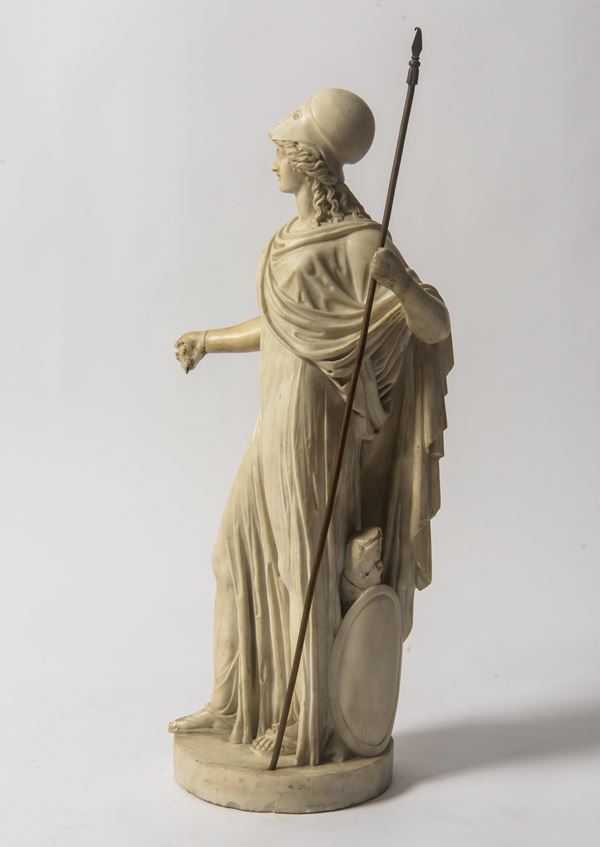Scultura raffigurante Minerva stante, con elmo e veste all’antica; la figura regge una lancia (asta in metallo verosimilmente sostitutiva) e presenta il braccio sinistro proteso. L’impostazione deriva dai modelli della statuaria classica, secondo un linguaggio composto e misurato.