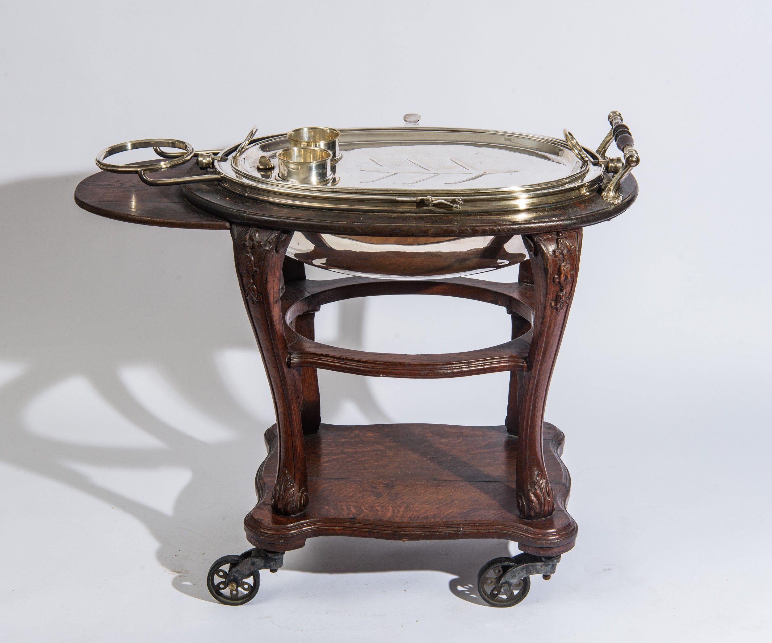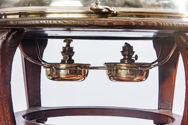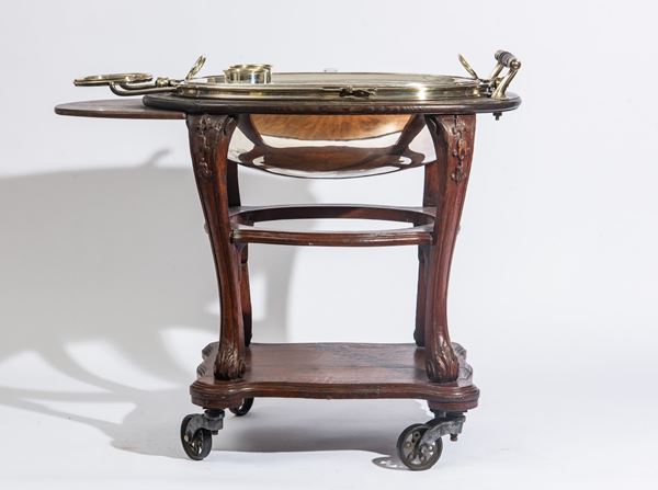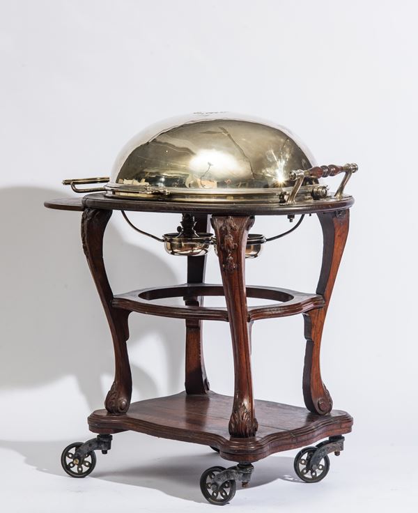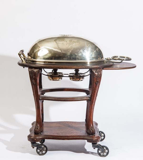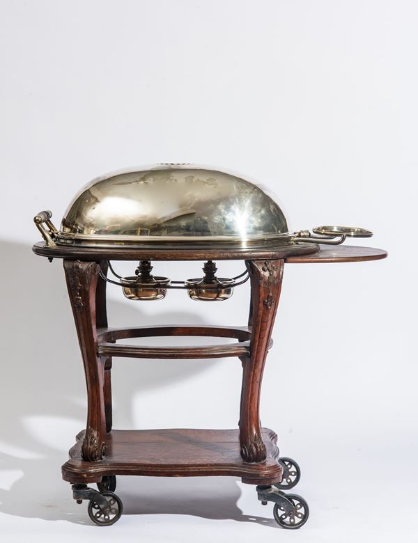 Elegante scaldavivande da sala. Struttura in legno con piano sagomato, cupola e componenti in metallo argentato; ruote in metallo. La parte superiore è costituita da cupola emisferica incernierata con maniglie laterali; all’interno sono presenti bruciatori per il mantenimento in caldo delle vivande. Il sostegno ligneo è dotato di ripiano inferiore e poggia su quattro ruote piroettanti.