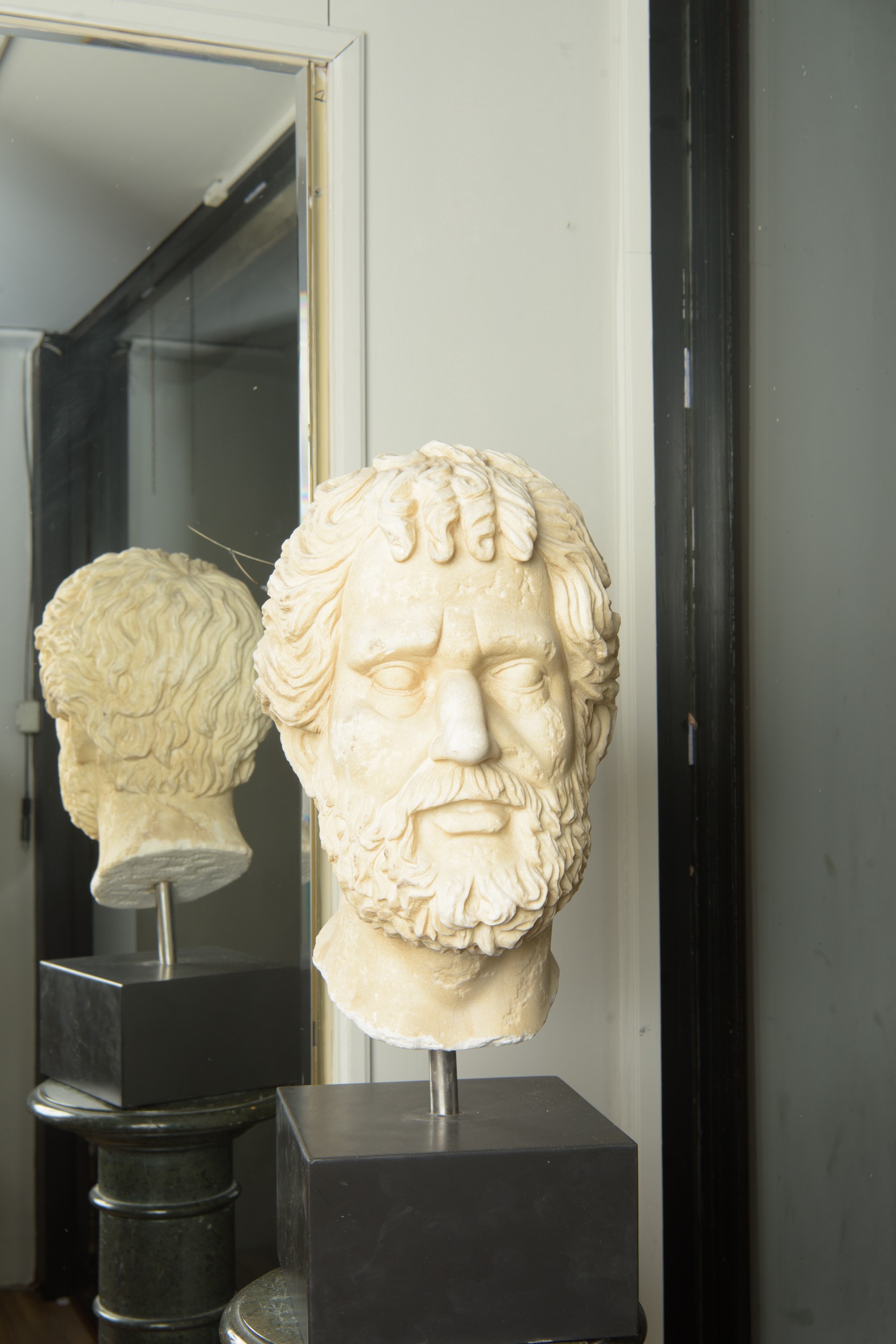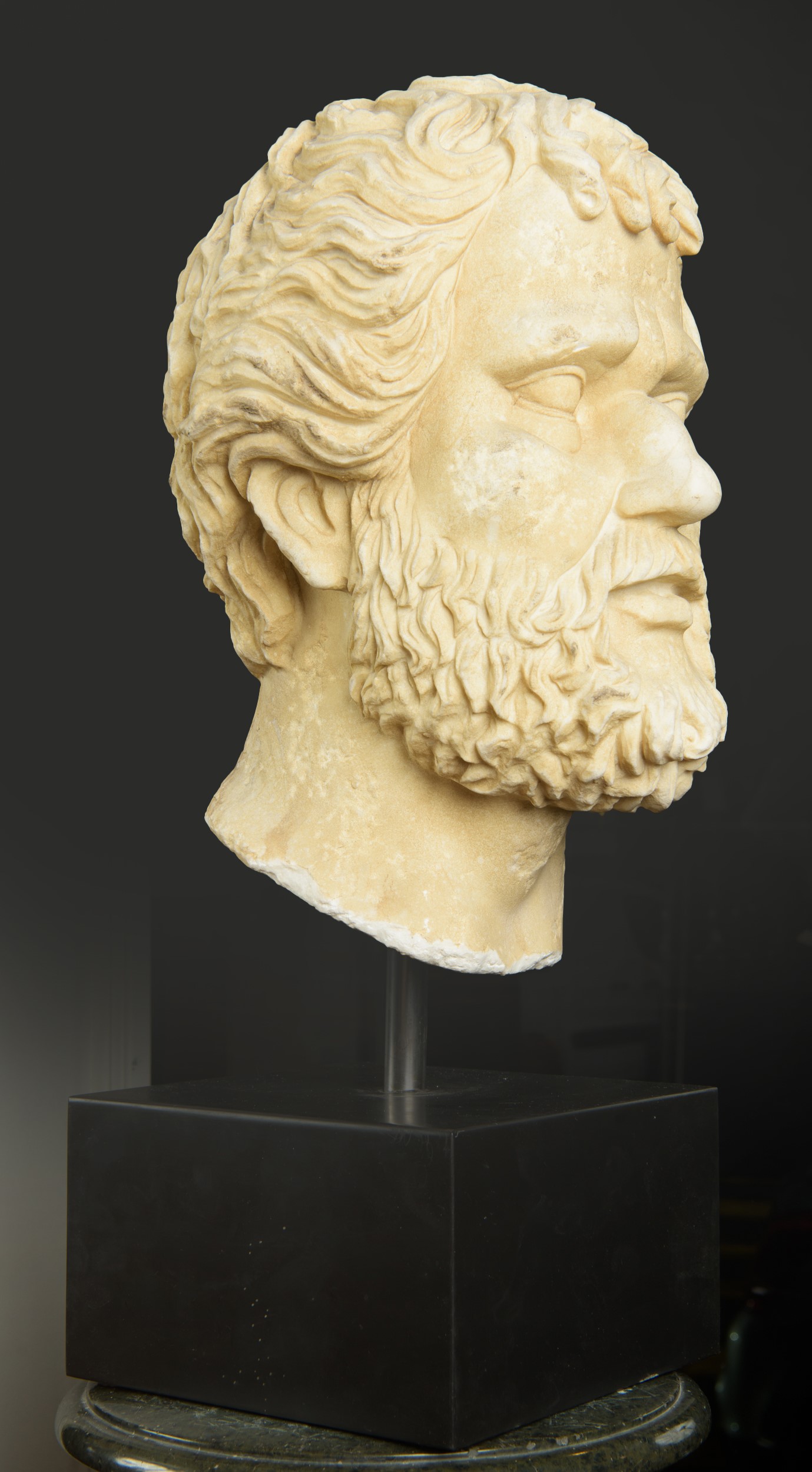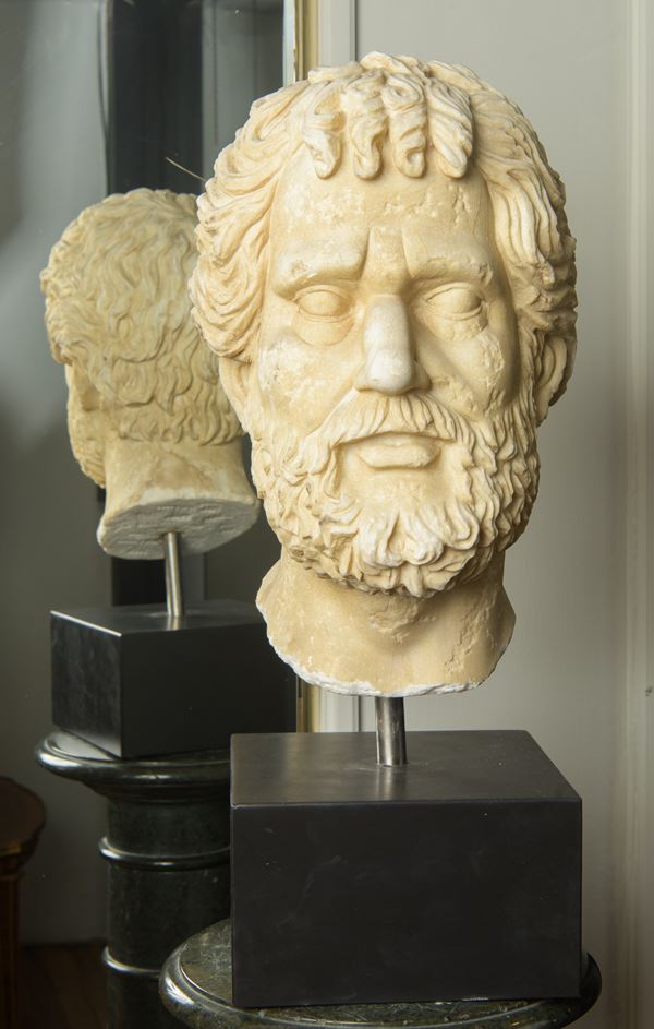 Scultura in marmo bianco raffigurante testa maschile barbata, ispirata ai modelli della ritrattistica greco-romana di età classica. Poggiante su basamento metallico non coevo.