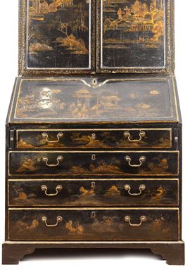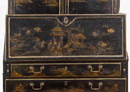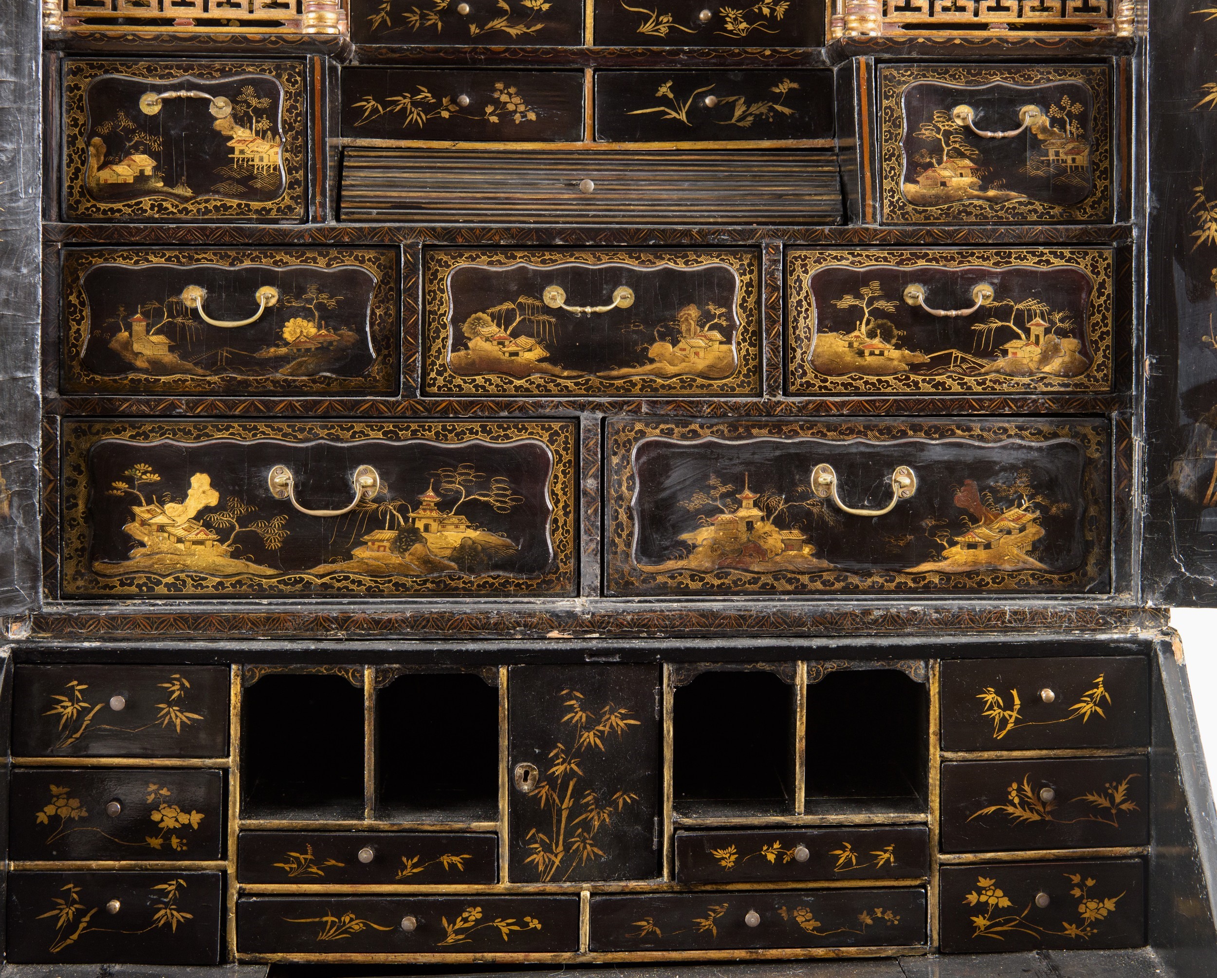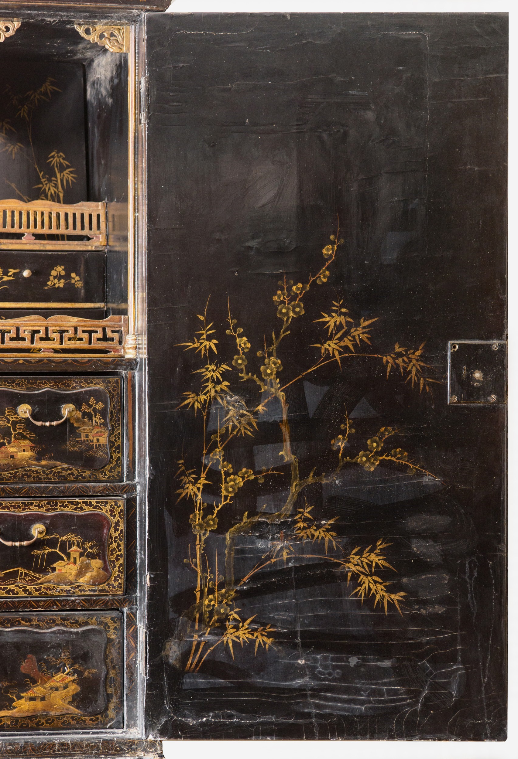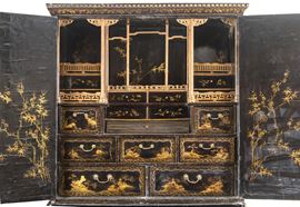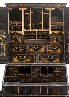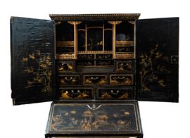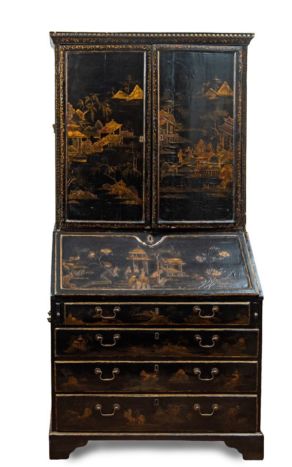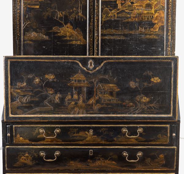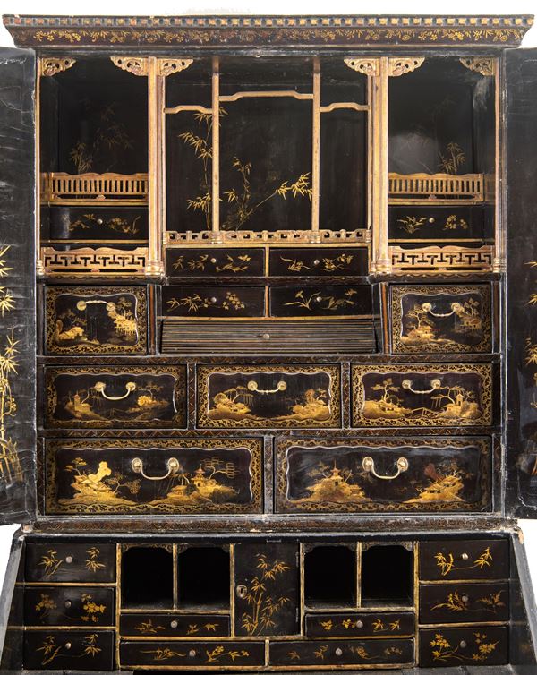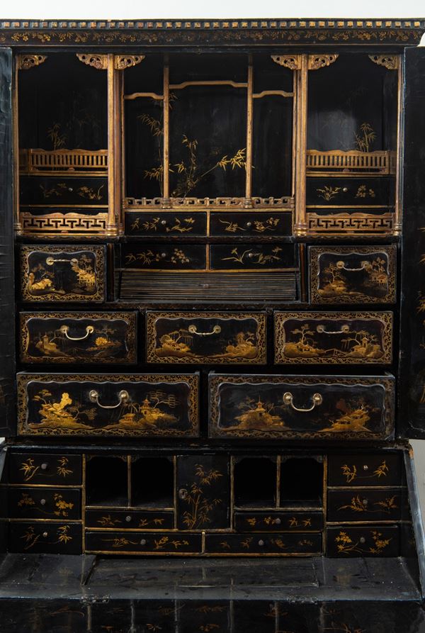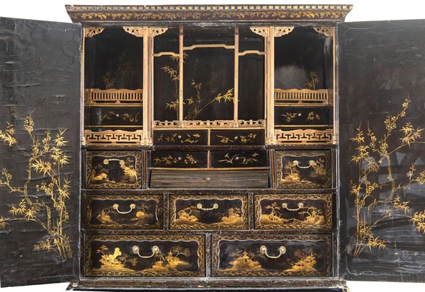 L’intero arredo è rivestito in lacca nera decorata con motivi di gusto chinoiserie di ispirazione Coromandel, caratterizzati da ricche scene ornamentali e figurative.