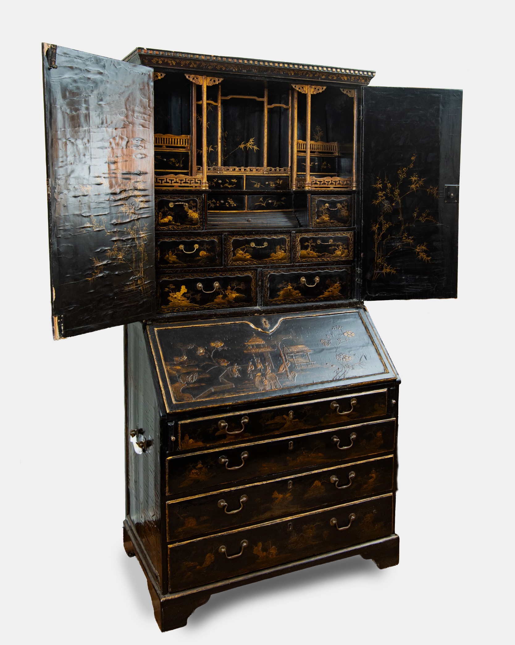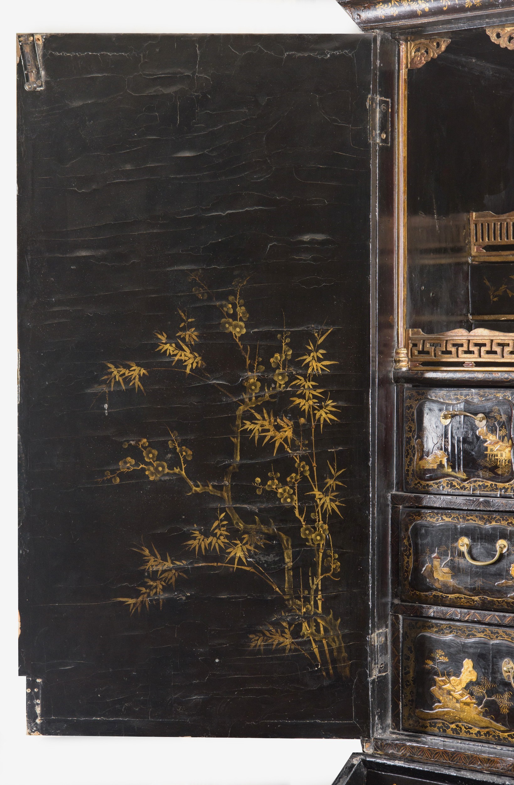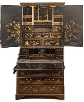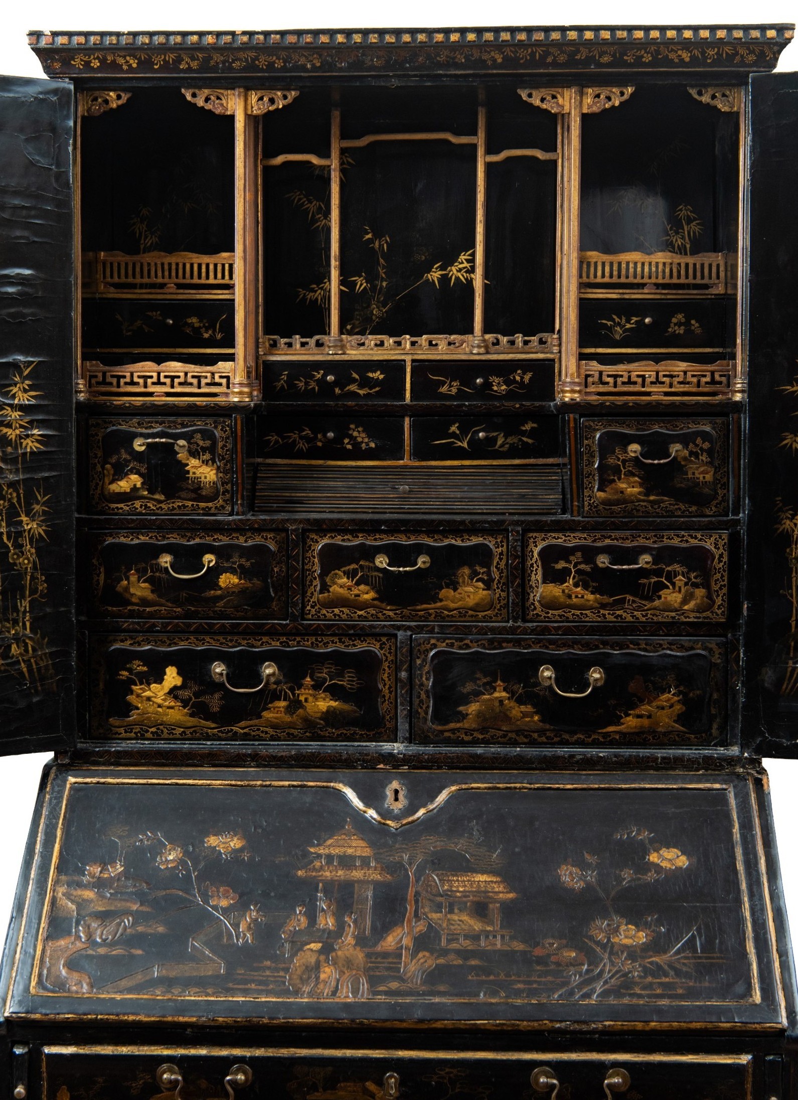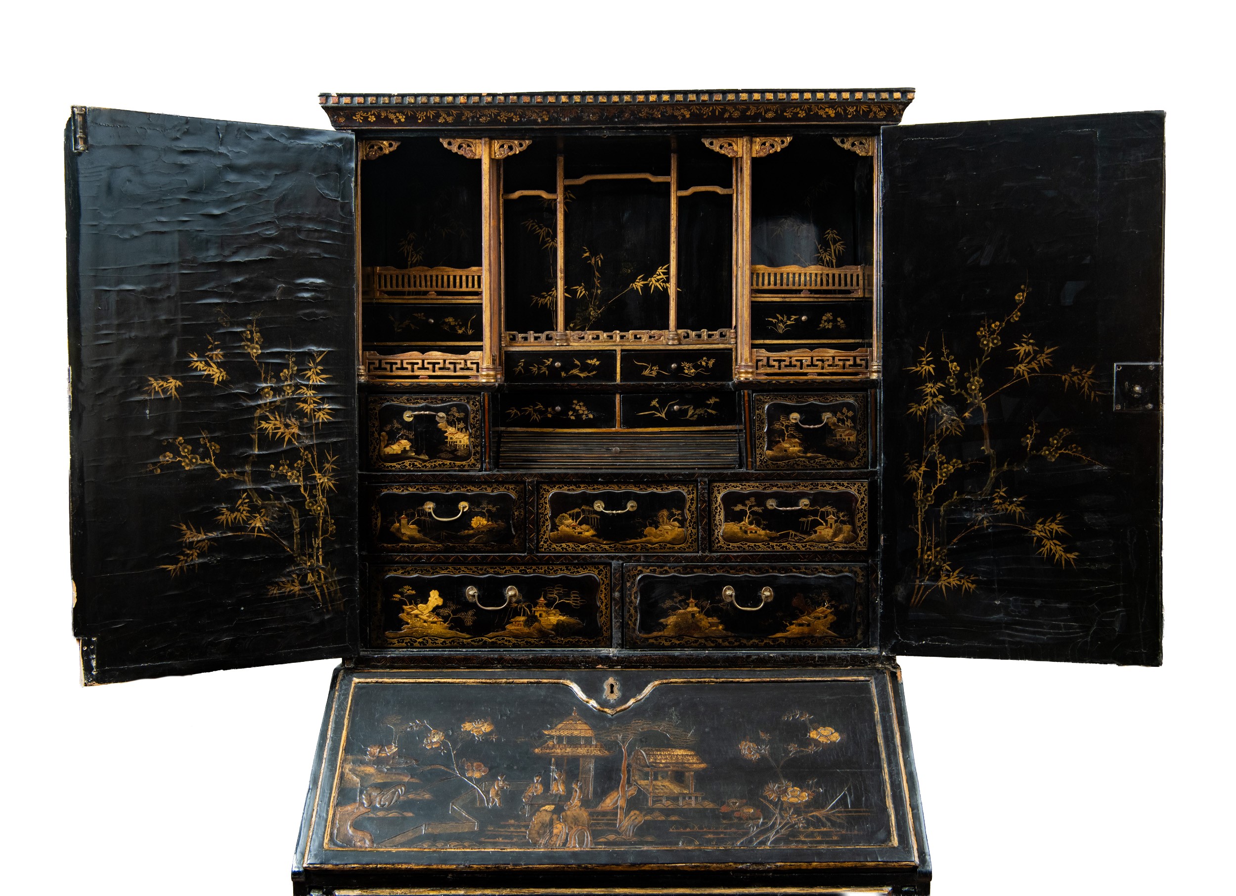 L’intero arredo è rivestito in lacca nera decorata con motivi di gusto chinoiserie di ispirazione Coromandel, caratterizzati da ricche scene ornamentali e figurative.