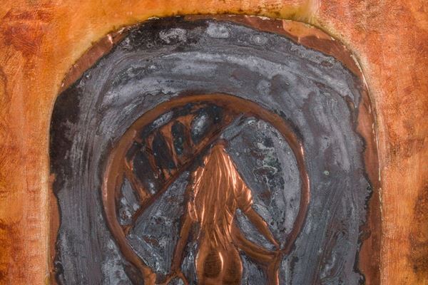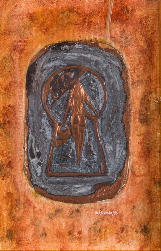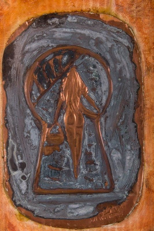 serie "L'occhio nascosto", lastra di rame sbalzato, firmata e datata, entro teca