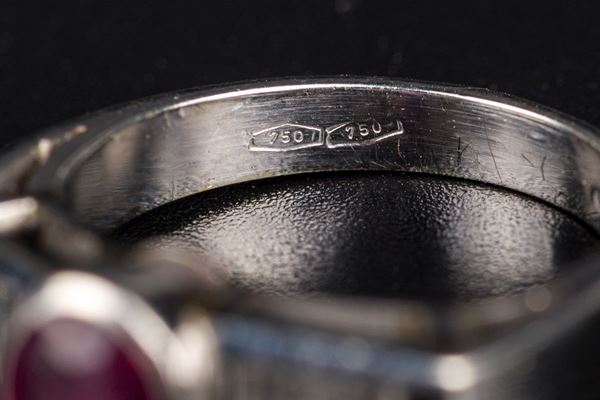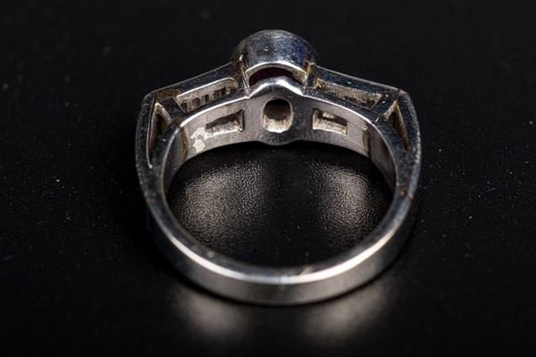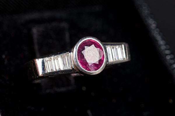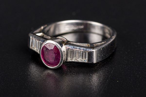 con rubino termotrattato e diamanti per 0,12 pt di carato, taglio taper, peso lordo: 6,7 gr.