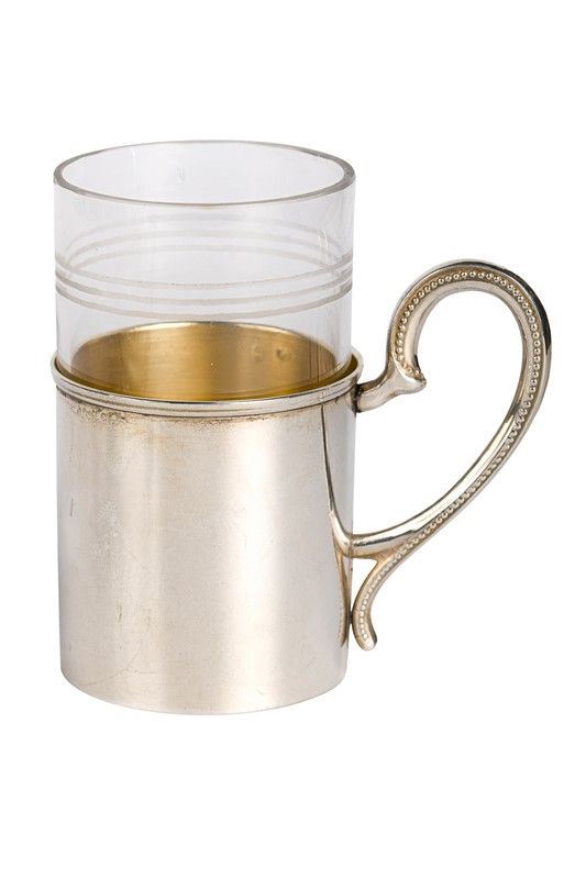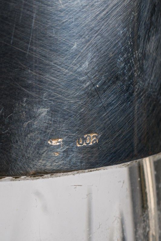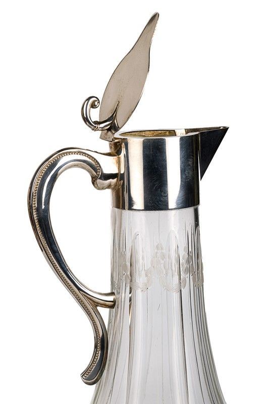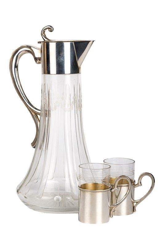 Caraffa con 12 bicchierini in argento 800 e vetro molato