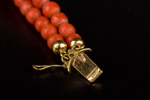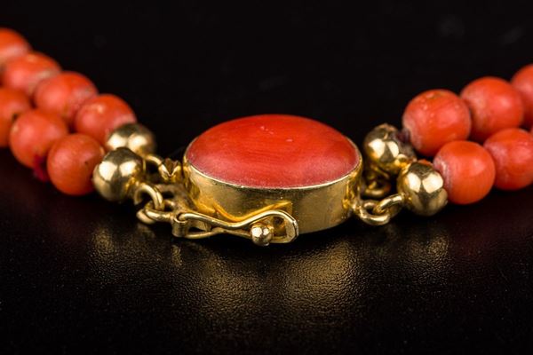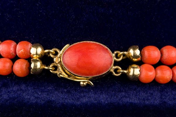 montato con chiusura in oro giallo 18kt e un cabochon di corallo rosso, peso: gr. 43,5