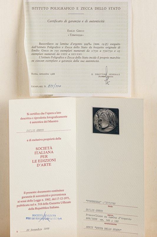 n. 277/750, bassorilievo su lamina d'argento 999/1000, mm 145 x 190, entro teca, con certificato di autenticità