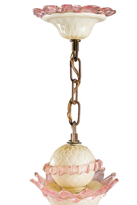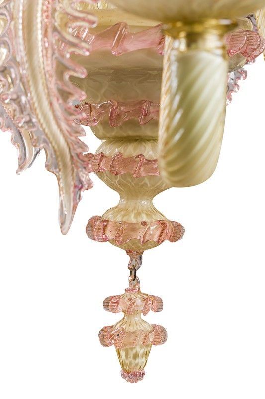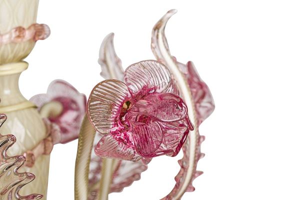 in vetro incolore e rosa, a sei bracci intervallati da foglie curvate e da fiori rosa, mancanza di una foglia