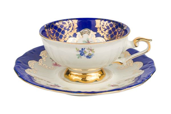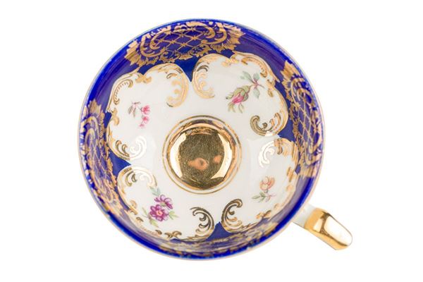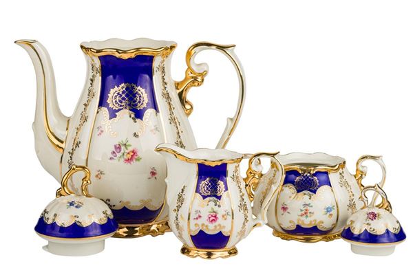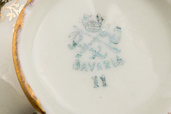 con decoro floreale su fondo bianco e blu di Prussia, finiture dorate, firmato Bavaria, piccole filature