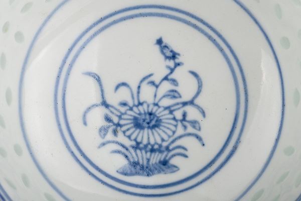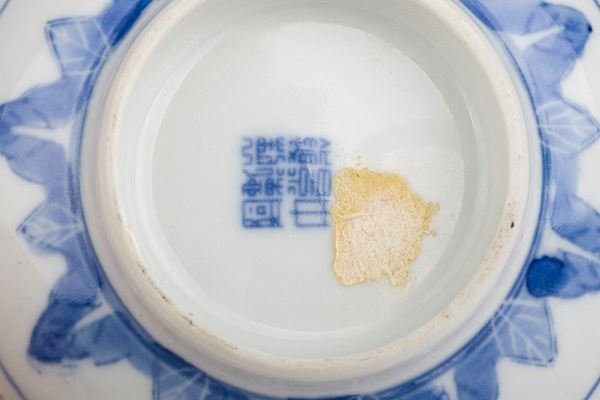 decori blu su fondo bianco con motivo a chicchi di riso, marchio sul fondo