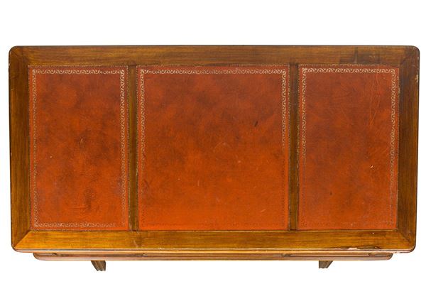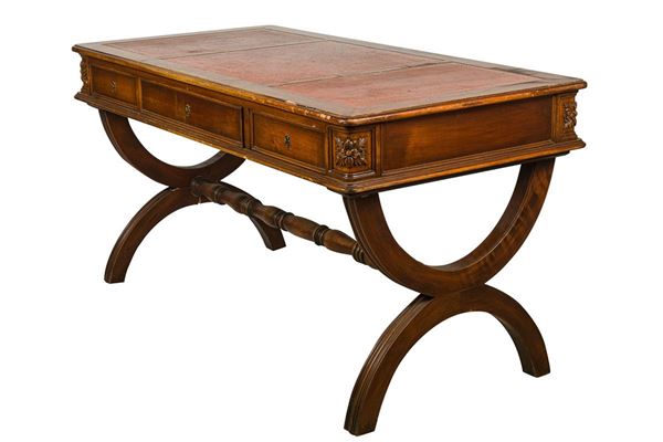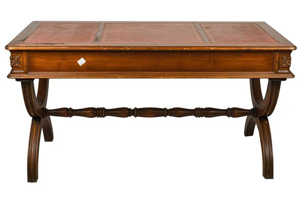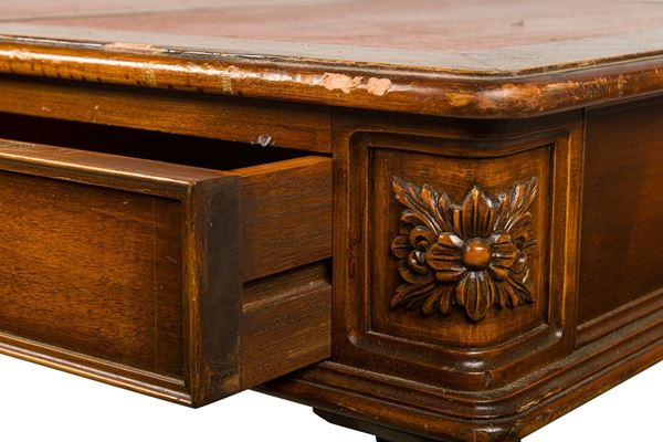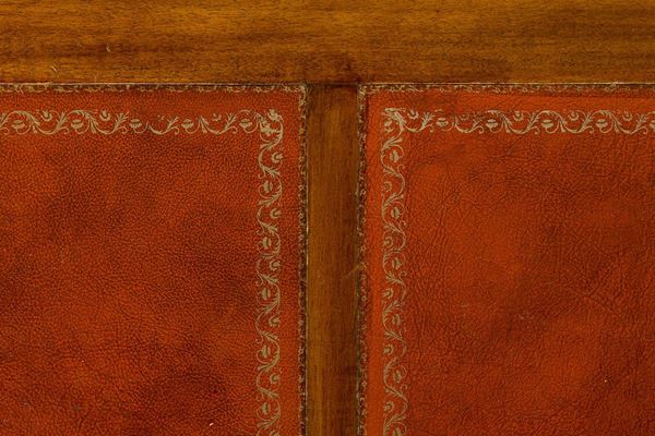 in legno tinto a noce, a tre cassetti, con piano in pelle, restauri