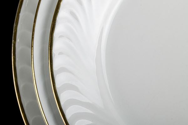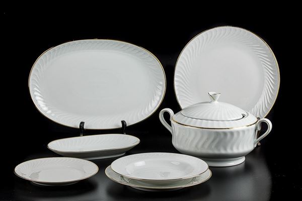 in porcellana bianca con finitura dorata, firmato Bavaria, composto da: 12 piatti piani, 12 piatti fondi, 10 piattini da dolce, 1 zuppiera e 2 piatti da portata, incompleto