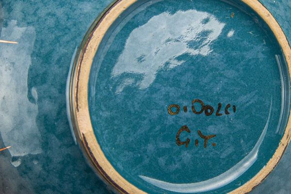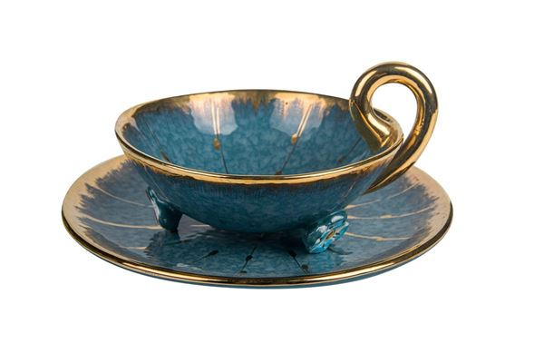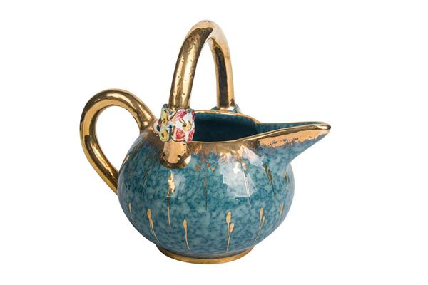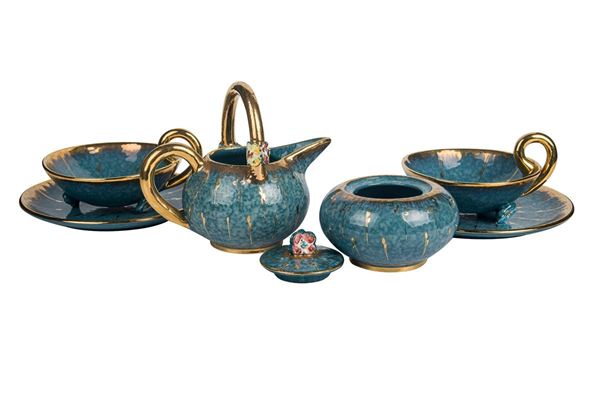 in ceramica smaltata, composto da: 7 piattini, 7 tazzine, 1 lattiera, 1 zuccheriera