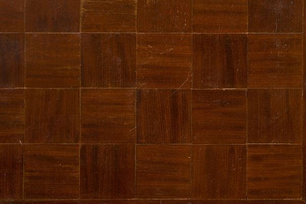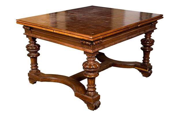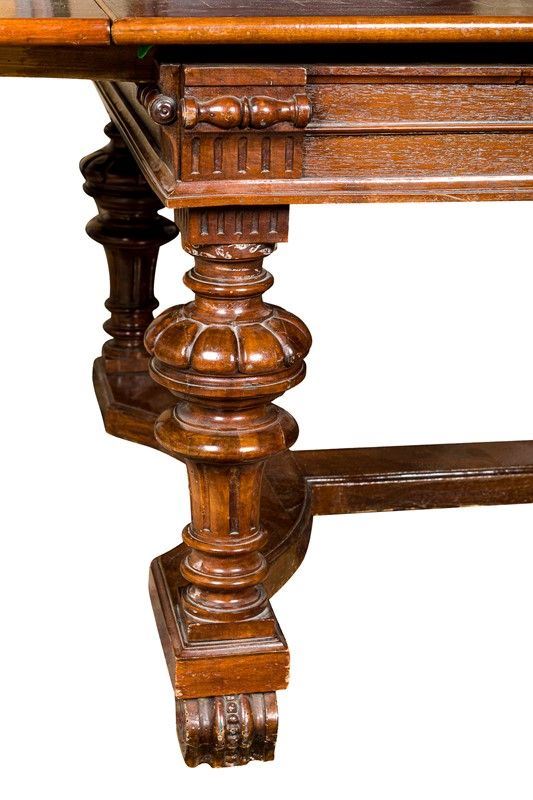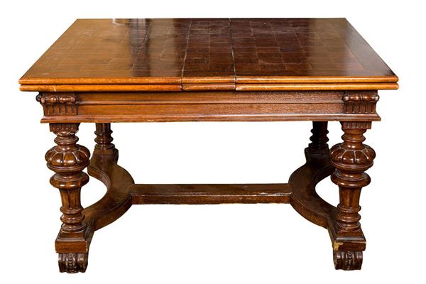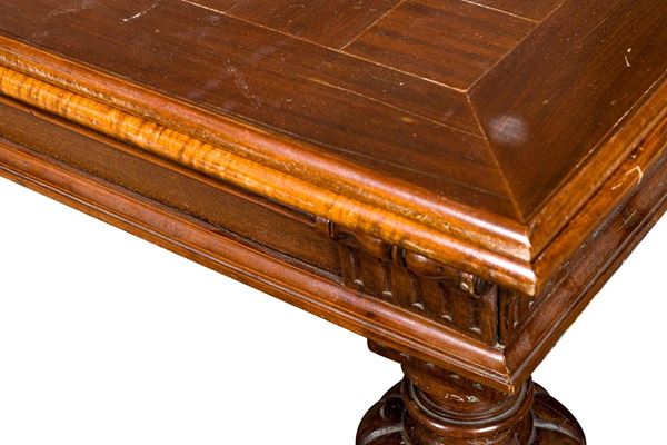 in legno di mogano, con quattro gambe tornite, completo di 2 prolunghe. Difetti e mancanze