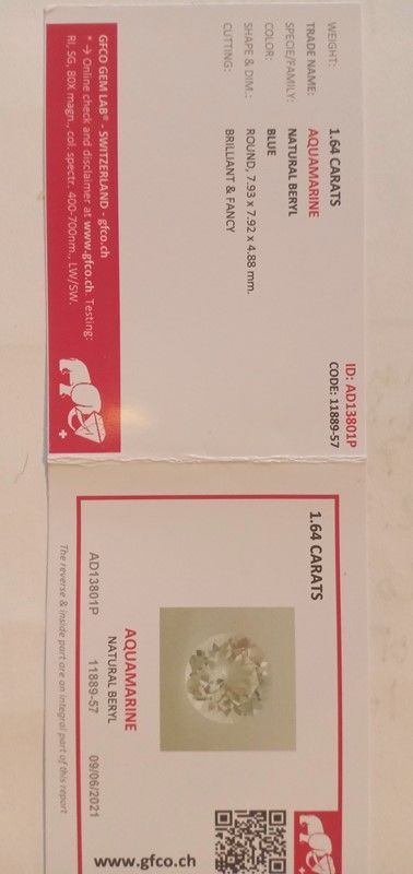 Colore: azzurro - 1.64 carati - Provenienza: Brasile - Purezza: SI - Forma: rotonda - Dimensioni: 7.93 x 7.92 x 4.88 mm - Taglio: brillante & fantasia - non termotrattata, non trattata - con certificato GFCO (Laboratorio svizzero) numero AD13801P