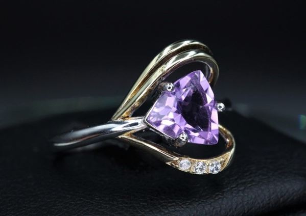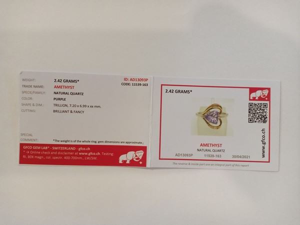 Colore: viola - Provenienza: Brasile - Forma: triangolare - 7.20 x 6.99 mm - Taglio: brillante & fantasia - con certificato GFCO (Laboratorio svizzero) numero AD13093P - Peso totale: 2.42 grammi - Taglia: 54