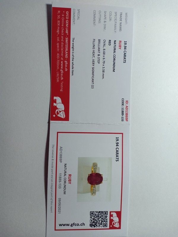 Colore: rosso - 3.70 carati - Provenienza: MADAGASCAR - Forma: ovale - Taglio: brillante & a gradini - Misure: 8.68 x 6.79 x 3.58 mm - termotrattata - con certificato GFCO (Laboratorio svizzero) numero AD13869P - Peso totale: 19.94 carati - Taglia: 56