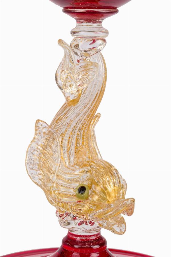 in vetro rosso di Murano con figure di pesce ed elementi in oro, firmati Barovier & Toso