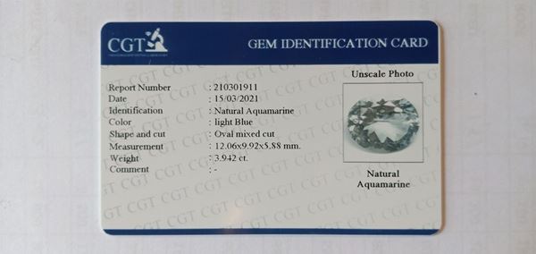 Colore: celeste - 3.94 carati - Provenienza: Brasile - Forma: ovale - Taglio: brillante & a gradini - dimensioni: 12.06 x 9.92 x 5.88 mm - non termotrattata, non trattata - con certificato CGT numero 210301911 - peso totale: 1.24 gr