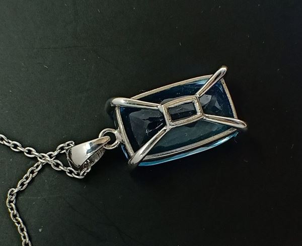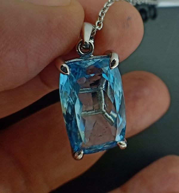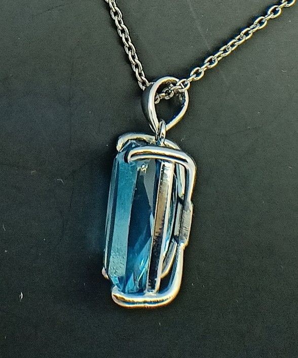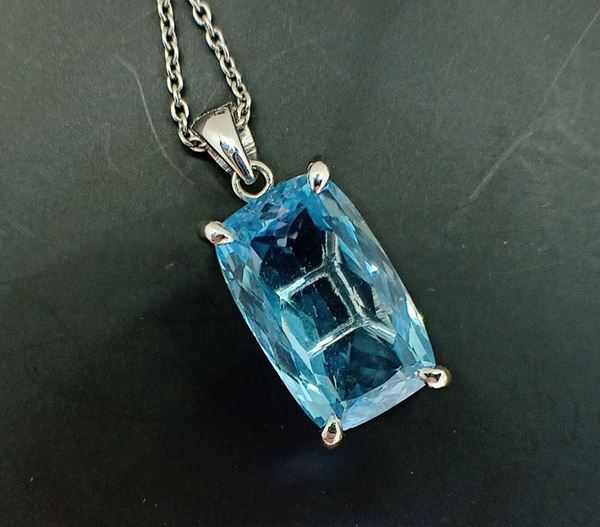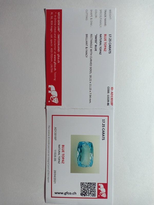 Colore: blu svizzero - 17.25 carati - Provenienza: Brasile - - Forma: rettangolo con lati curvi - Taglio: brillante & fantasia - Dimensioni della pietra: 18.22 x 11.15 x 7.94 mm - con certificato GFCO (Laboratorio svizzero) numero AD13018P - Peso totale: 5.65 grammi