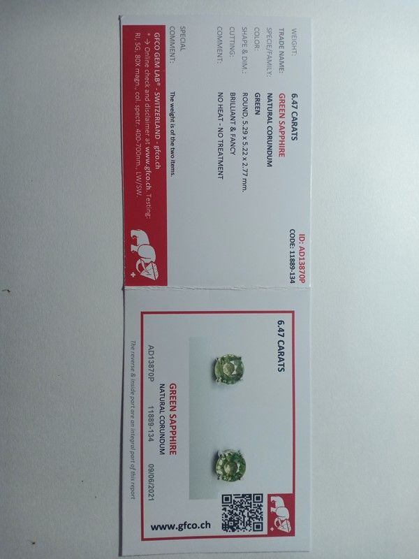 Colore: verde - Provenienza: CEYLAN SRI LANKA - 1.69 carati - Forma: rotonda - Dimensioni : 5.29 x 5.22 x 2.77 mm - con certificato GFCO (Laboratorio svizzero) numero AD13870P - non trattato, non termotrattato - Peso totale: 6.47 carati