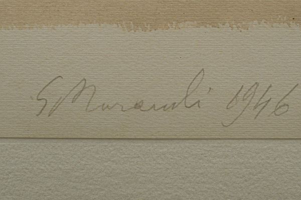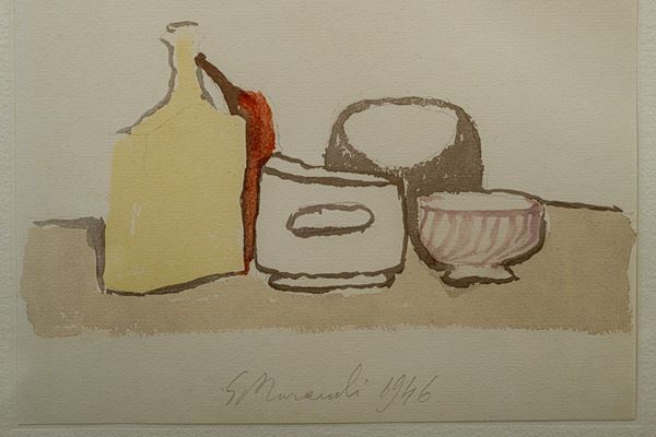 stampa da acquerello, tratta dalla serie a cura di Valerio Zurlini, "50 acquarelli di Giorgio Morandi", editore Ilte, Torino 1973, firma e data stampate in basso al centro, sul verso timbro "Stampa Ilte, Torino", in cornice