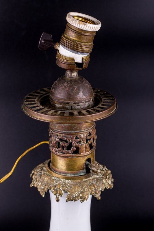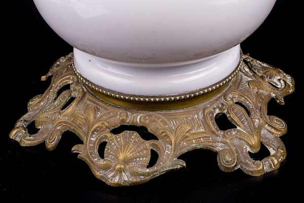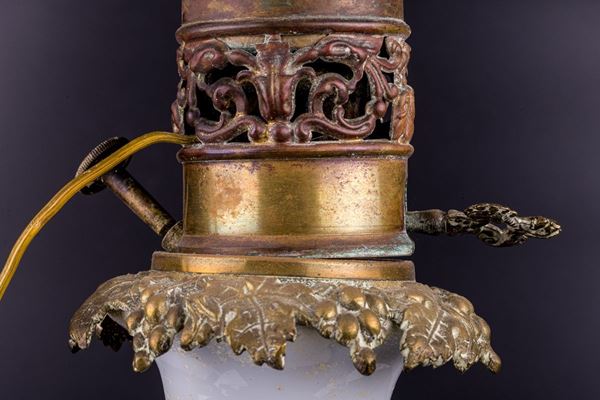 in vetro opalino e bronzo dorato, con paralume in stoffa