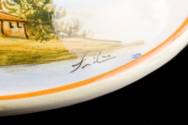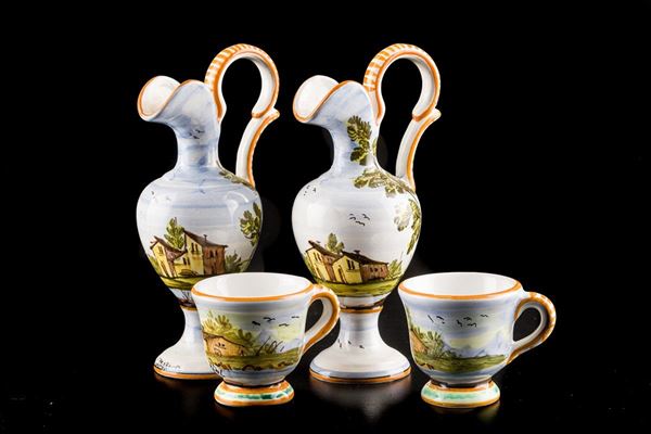 dipinti a mano con paesaggi campestri, di cui: una biscottiera (cm 21 x 16), un versatoio (cm 17), una coppia di anforette (cm 17), un piccolo centrotavola traforato (cm 5 x 22) e una coppia di tazzine da caffè (cm 6)
