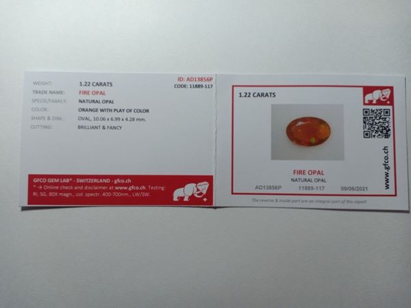 Colore: arancio, con gioco di colori - 1.22 carati - Provenienza: Etiopia - Forma: ovale - Misure: 10.06 x 6.99 x 4.28 mm - Taglio: brillante & fantasia - con certificato GFCO (Laboratorio svizzero) numero AD13856P