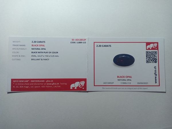 Colore: nero, con gioco di colori - 2.20 carati - Provenienza: Etiopia - Forma: ovale - Misure: 13.27 x 7.92 x 5.25 mm - Taglio: brillante & fantasia - con certificato GFCO (Laboratorio svizzero) numero AD13852P