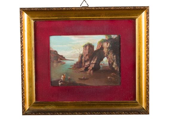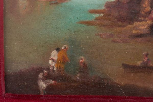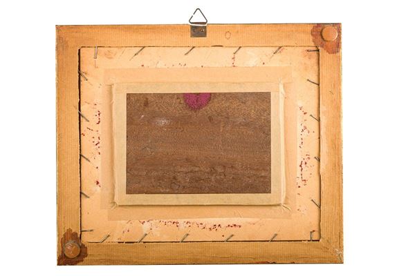 e figure in primo piano, con passepartout in velluto rosso e cornice
