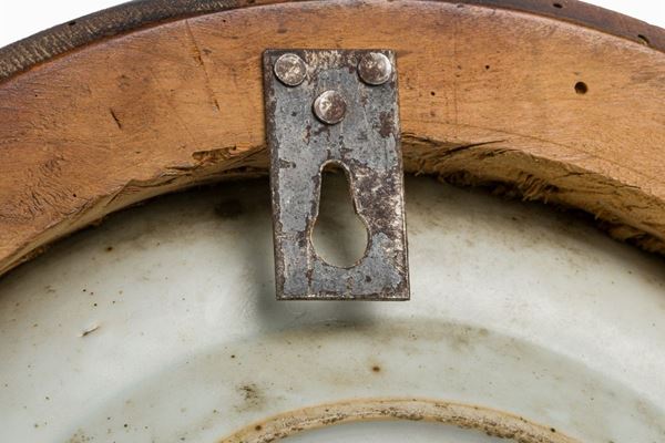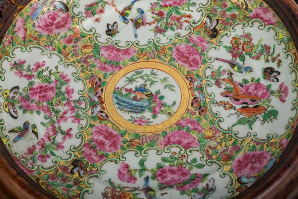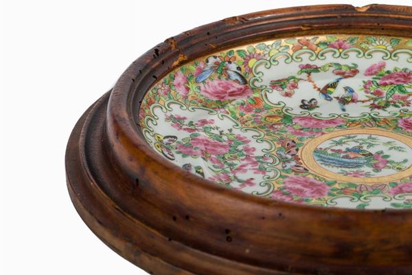 in ceramica, finemente dipinto a smalto con decori floreale e zoomorfi, in cornice