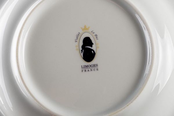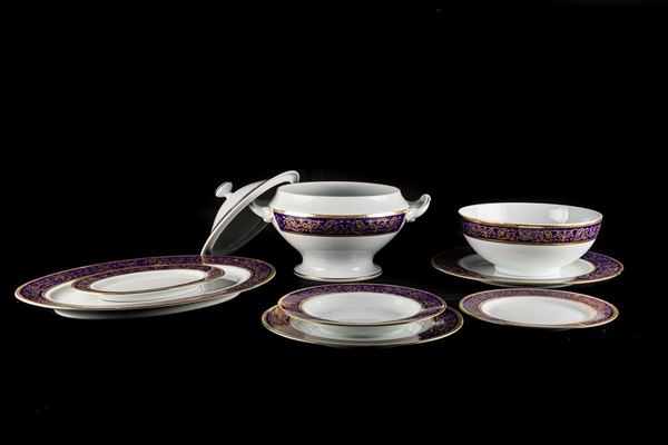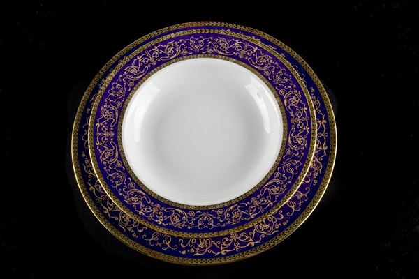 con fine decoro cobalto e oro, completo di 24 piatti piani, 12 piatti fondi, 12 piatti da dessert, due piatti ovali da portata, un piatto tondo da portata, un'insalatiera e una zuppiera
